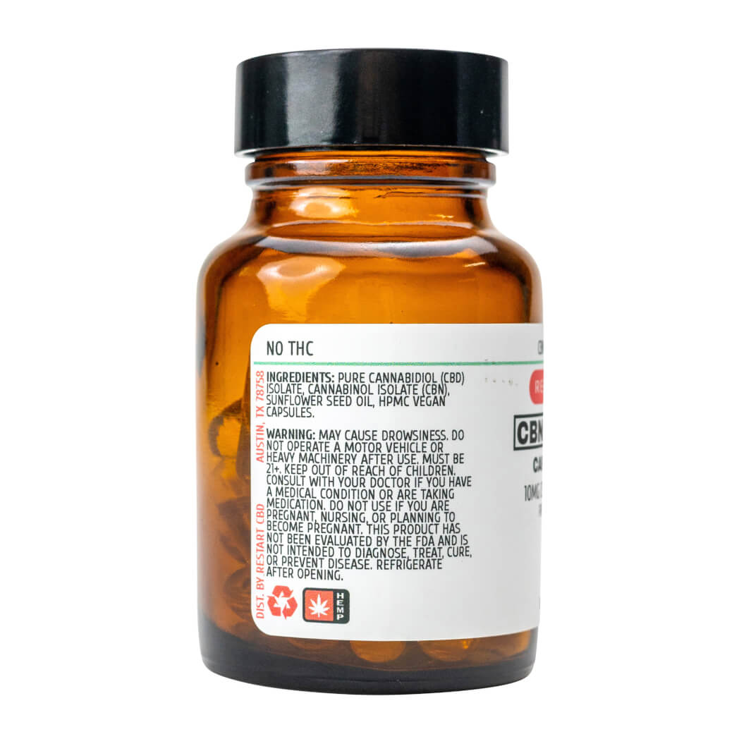 RESTART Night Formula CBD CBN capsules features a 3:1 ratio of CBD to CBN. Cannabinol (CBN) is a minor cannabinoid getting some major attention lately. This nightime CBD + CBN formula was crafted in-house by our expert team of scientists, and lab-tested for purity, potency, as well as to ensure there are no pesticides, herbicides, or heavy metals.