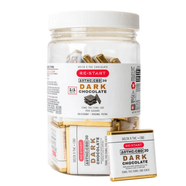 When it comes to Delta 9 THC Chocolates, RESTART CBD offers only the best. Our mini chocolate squares are no exception with their delicious silky texture and rich flavor that are perfect for when you need ‘a little something sweet’. Packed with 15mg of hemp-derived, dispensary-grade Delta 9 and 15mg of USA-grown CBD per square. Each chocolate square gives you a full body and mind adventure, creating a unique and enjoyable experience every time you have one of these sweet treats.