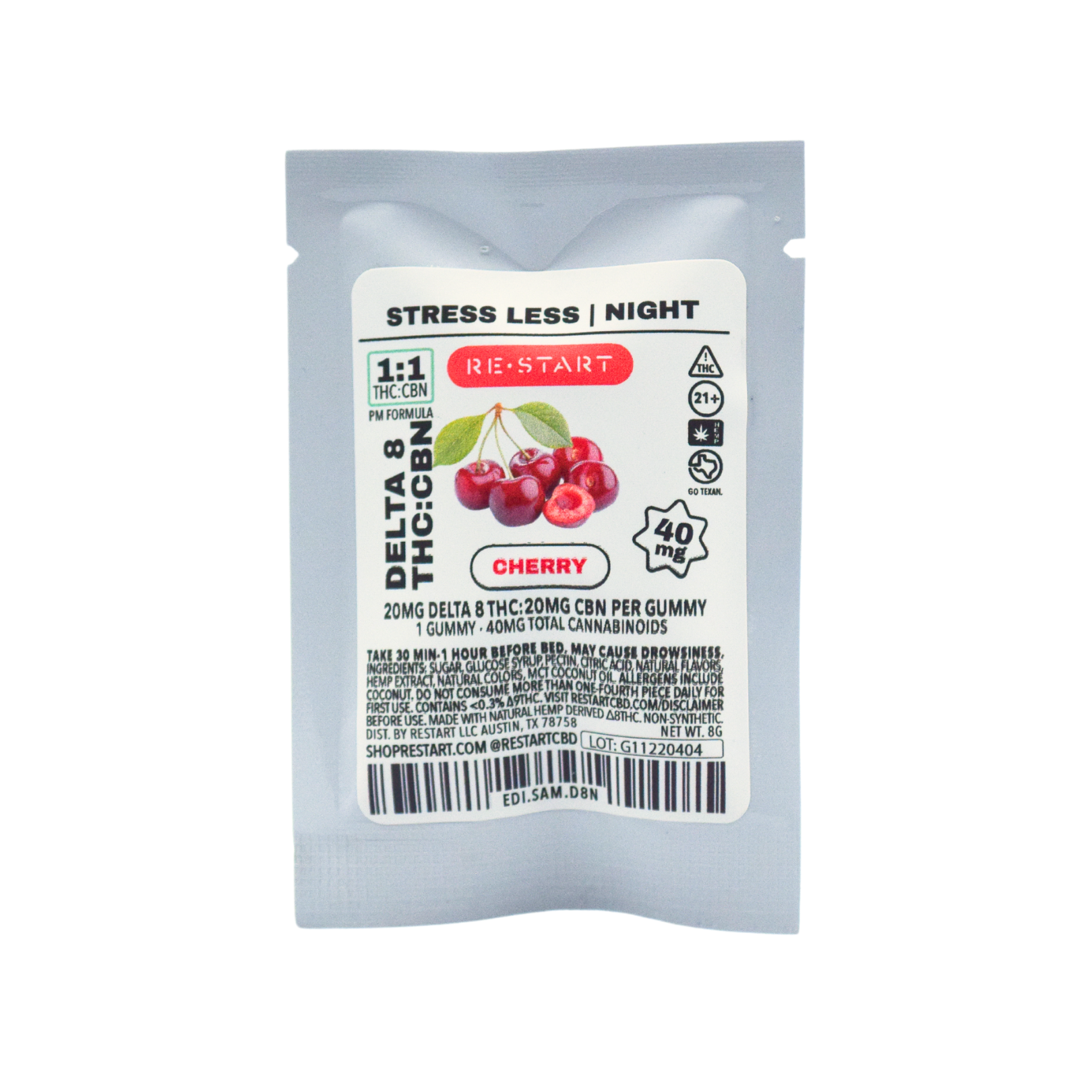 | Flavor: Cherry | Strength: 40mg (20mg ∆8THC + 20mg CBN) | Servings per Container: 1 |