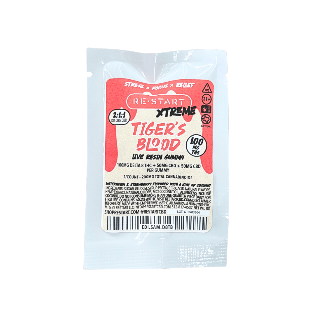 RESTART Delta 8 CBG CBD gummies are Extremely STRONG, vegan, non-GMO, gluten-free and low in sugar. Each gummy has 100mg of Delta-8 THC, 50mg of CBG and 50mg of CBD. They deliver a potent, one of a kind, uplifting and motivating feel with a calming body sensation that will have you feeling amazing. These gummies deliver a sweet, long-lasting Delta-8 high while still being nicely balanced with CBG & CBD.
