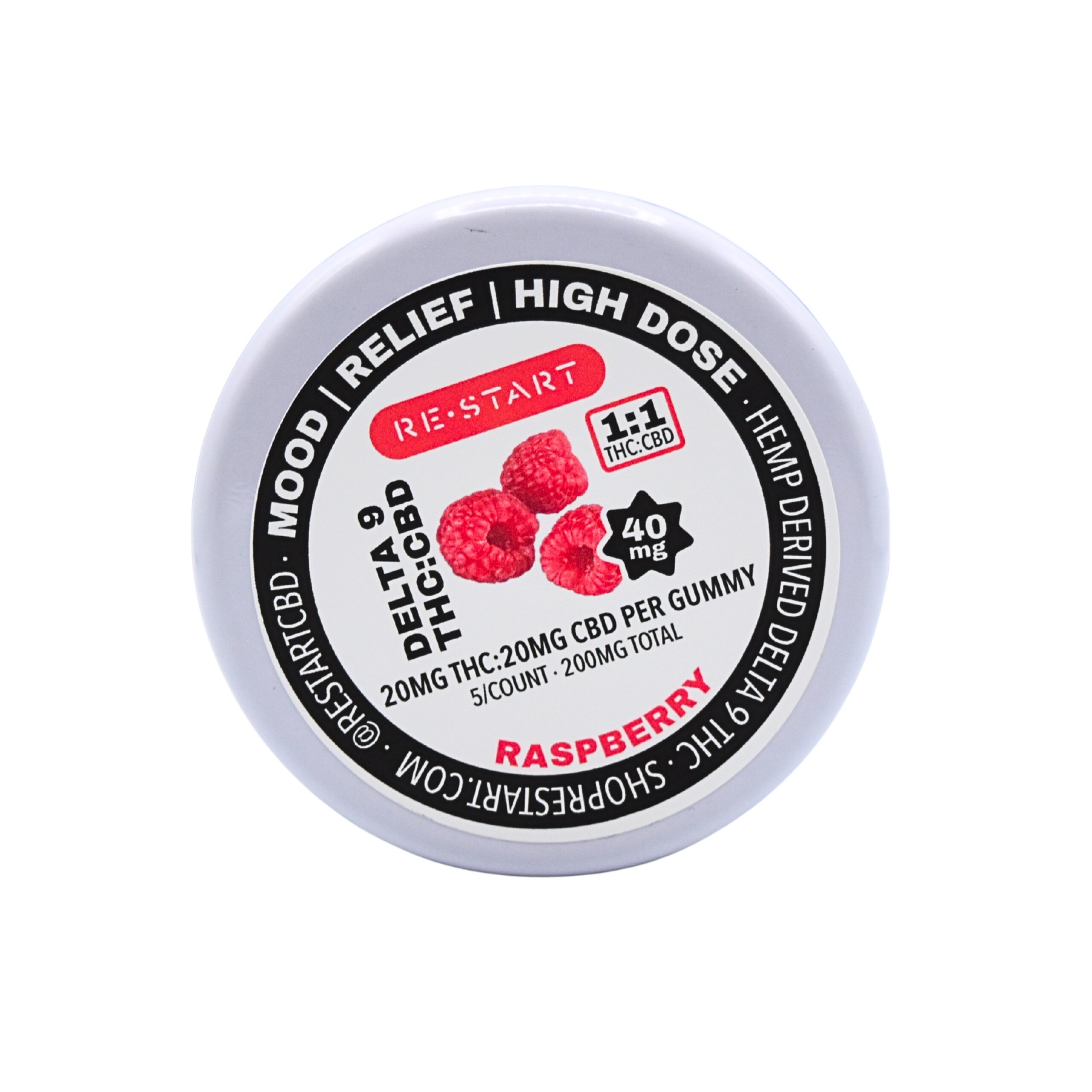 | Flavor: Raspberry + Sativa Terpenes | Strength: 40mg (20mg Δ9THC + 20mg CBD) | Servings per Container: 5, 10 or 30 |