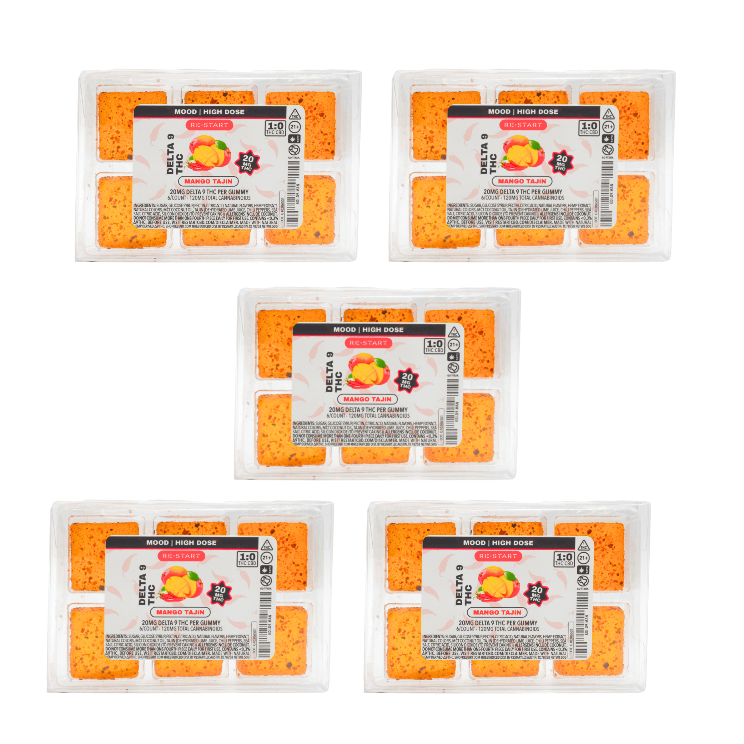Mango Tajín! Spicy, tangy, sweet, salty, and umami flavors will give your taste buds a run for their money. They taste just like a mangonada and once you taste them, you won’t ever look back.  RESTART Mango Tajín 20mg Delta 9 THC gummies deliver a long-lasting, ultra potent, one of a kind, uplifting, and motivating feel with a calming body sensation that will have you feeling amazing. Used to aid in relaxation and non-specific relief management. Made with the highest quality of ingredients.