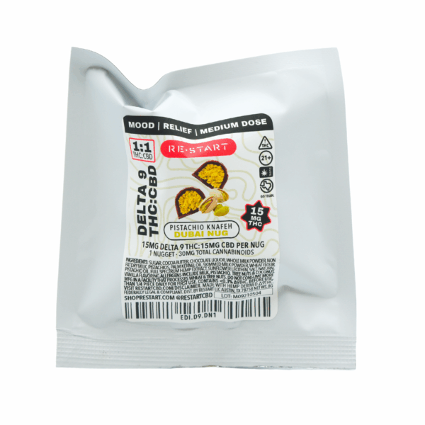 | Flavor: Dubai Pistachio Filling, Milk Chocolate | Strength: 30mg (15mg ∆9THC:15mg CBD) per serving | Servings per Package: 1 |