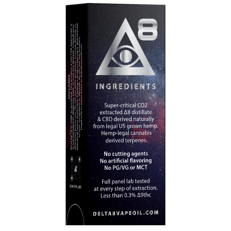 INGREDIENTS: Supercritical CO2 Extracted D8 distillate derived naturally from US grown hemp, natural and fruit terpene flavoring.
