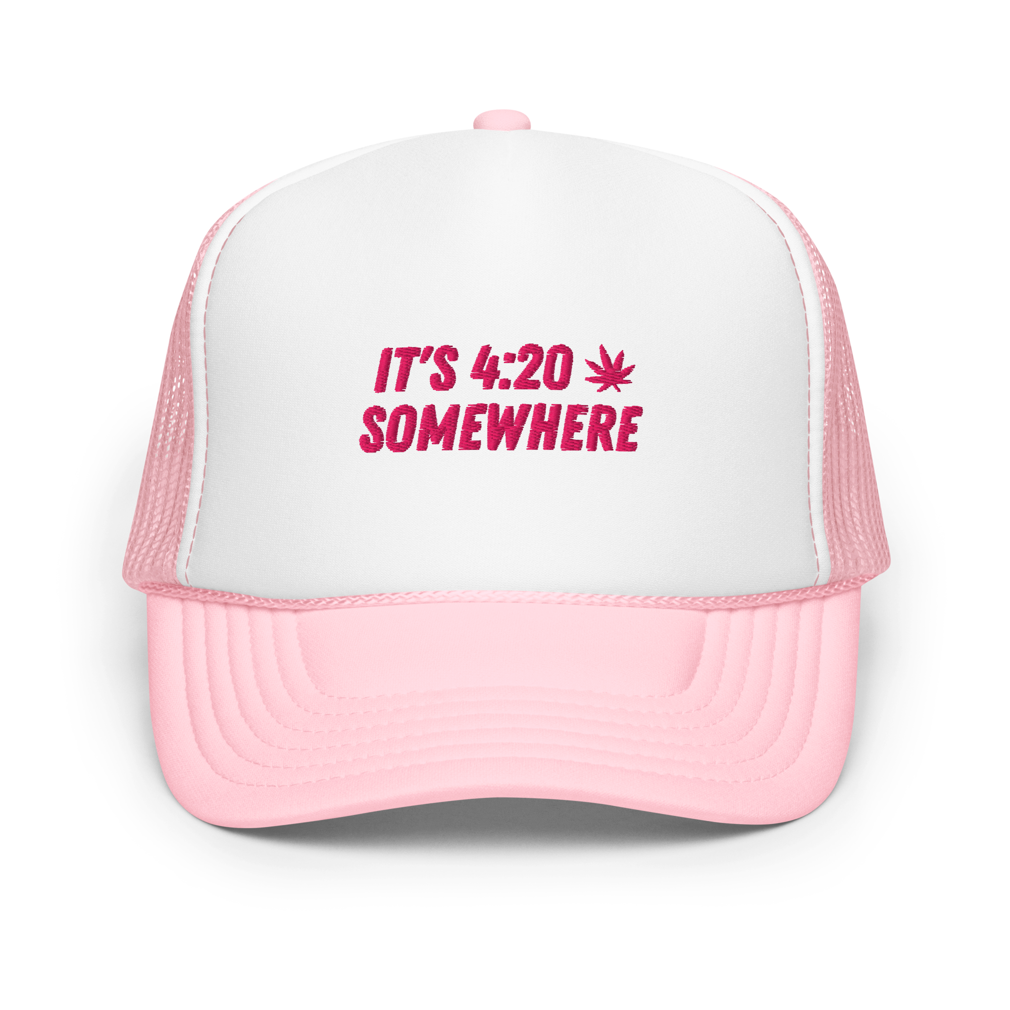 Stand out from the crowd with our “It’s 420 Somewhere” canna foam trucker hat! This head accessory is made with high-quality polyester and foam that guarantees a premium look and feel. The foam trucker hat has an adjustable snap that ensures a comfortable fit, and the mesh back provides great breathability. The matching color braid gives the hat an extra oomph. Style it with your favorite outfit any time of day anywhere you are.