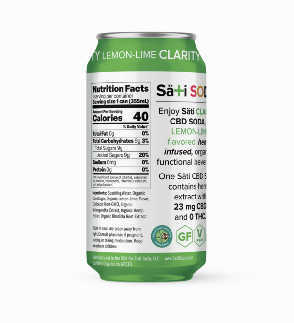 Lemon Lime Clarity CBD Soda Ingredients: Sparkling Water, Organic Cane Sugar, Organic Lemon-Lime Flavor, Non-GMO Citric Acid, Organic Ashwagandha Extract, Organic Hemp Extract, Organic Rhodiola