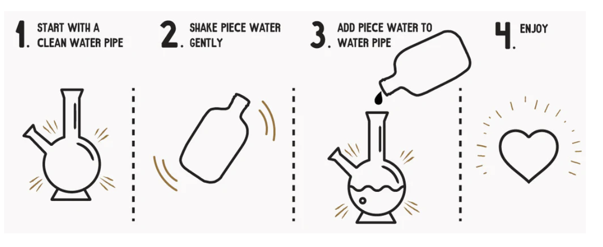 Piece Water Solution’s® unique proprietary blend of safe-all- natural mineral, vegetable, and fruit extracts work to prevent resin from forming on your bong, water pipe, or bubbler. It’s 100% All Natural and Absolutely Non-Toxic! Add Piece Water Solution® to a clean water pipe and your piece will remain clean and clear from resin build up. When you are ready to change your Piece Water Solution® simply rinse your pipe with tap water and it will be clean! In addition Piece Water Solution® acts as filter of particulate matter, which makes for cleaner & much smoother hits.