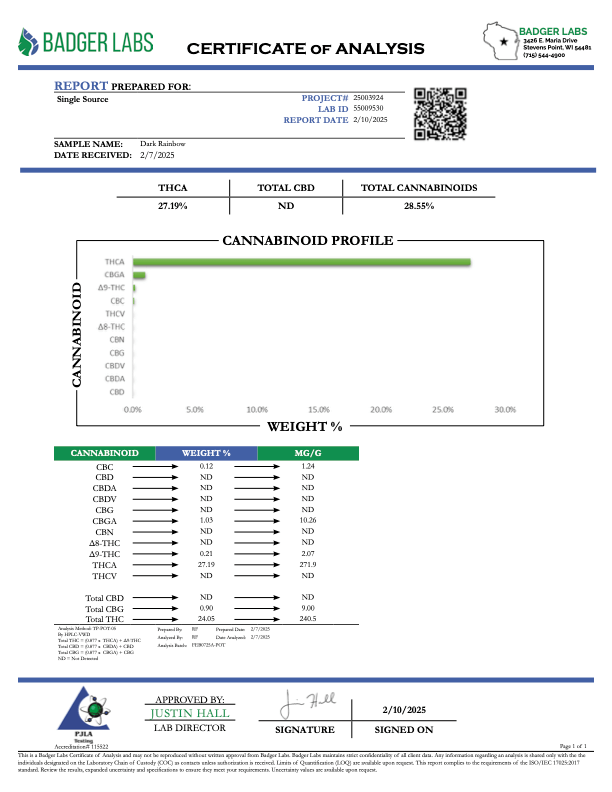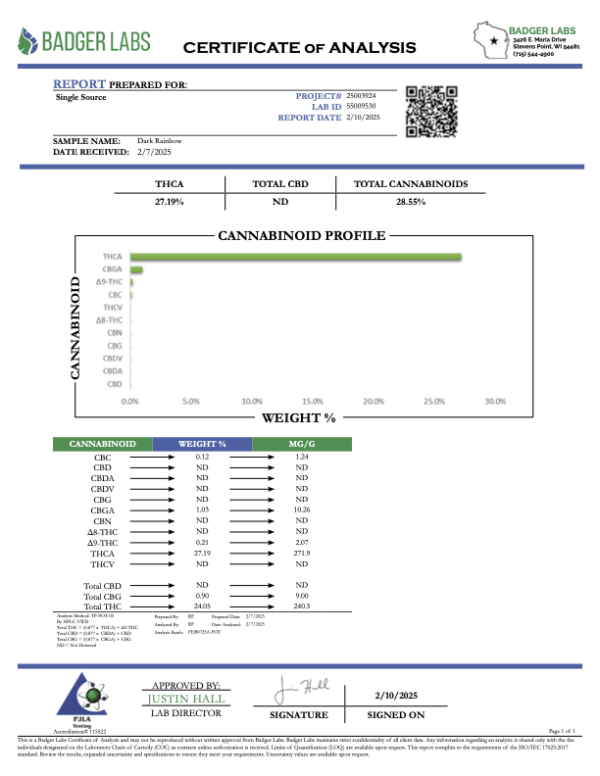 | Total Cannabinoids: 29.86% (298mg/g) | Potency: 27.19% THCa | .18% Δ9THC | .79% CBG | .12% CBC | Total THC: 25.31% (253mg/g) |