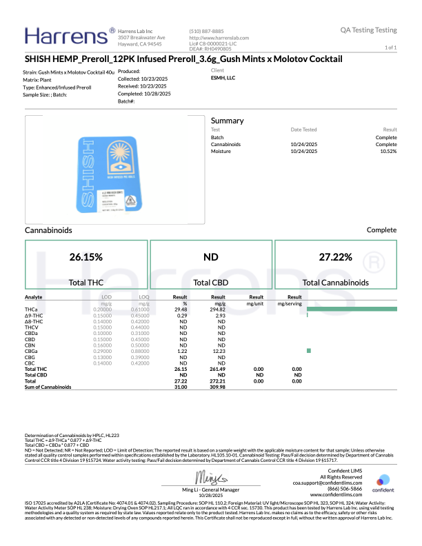 | Strain: Gush Mints x Molotov Cocktail (I) 29.48% (294mg/g) | Genetics: (Kush Mints x Durban Poison) + (Sour Diesel x Gas Mask) | Aroma: Creamy. Gassy Mint. Spicy. Citrus-diesel. |