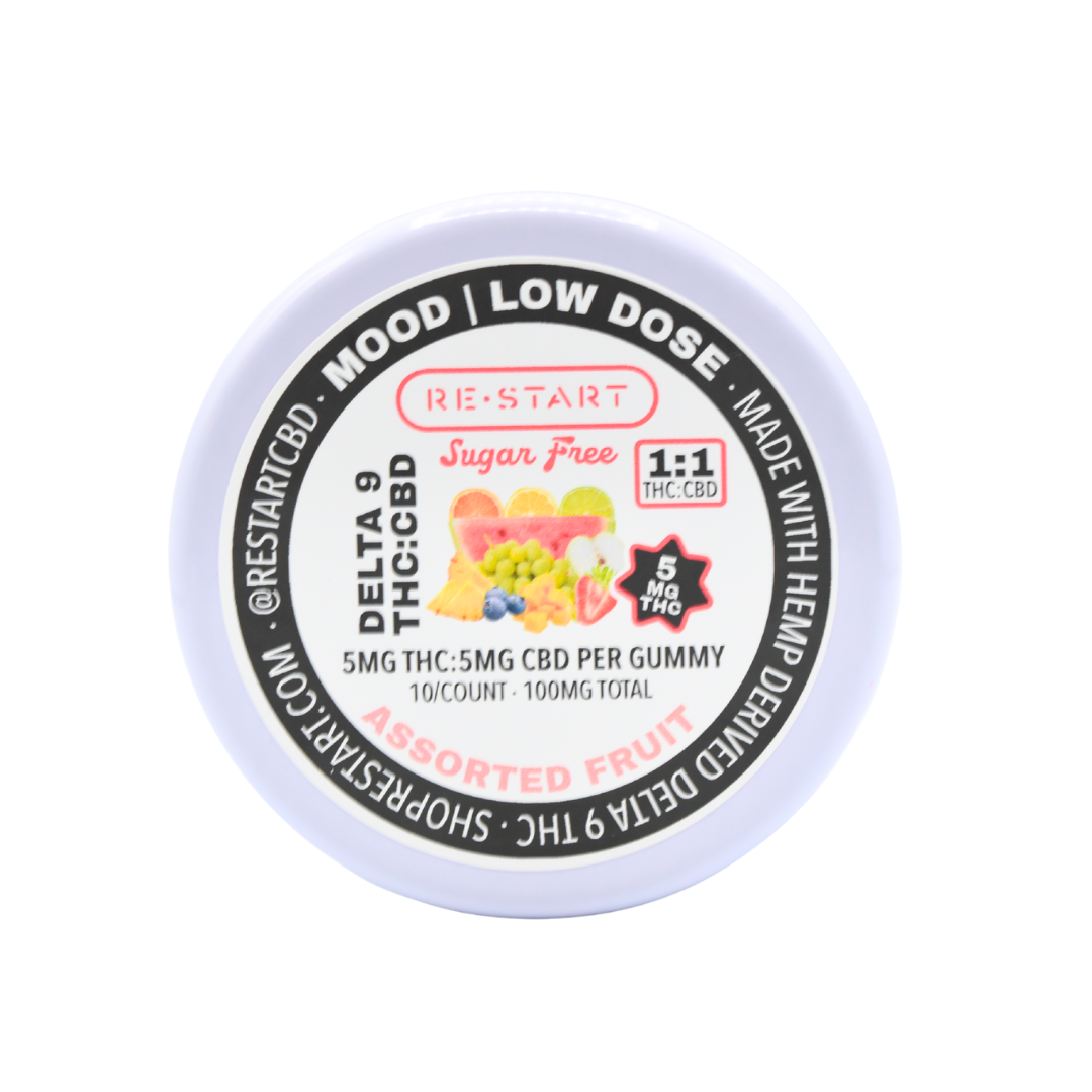 Elevate your downtime with a burst of fruity goodness—minus the extra sugar. Perfect for on-the-go use, each gummy is perfectly portioned, combining 5mg Delta 9 THC + 5mg CBD in equal measures for a balanced effect that adds a tasty pop of THC to your daily routine. We’ve created a health-conscious option that preserves the delicious fruit flavor you love. Experience the RESTART difference with our premium sugar-free alternative to traditional cannabis edibles.