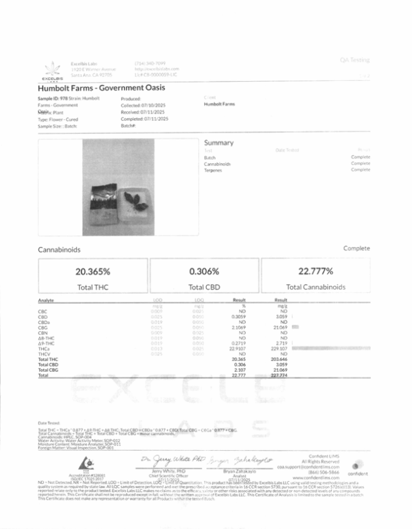 | Top Terpenes: Caryophyllene. Humulene. Pinene. Limonene. | Organically Grown by Humboldt Farms: California Hemp Flower Contains <0.3% Δ9THC | Effects: Relaxing. Sedative. Uplifting. |