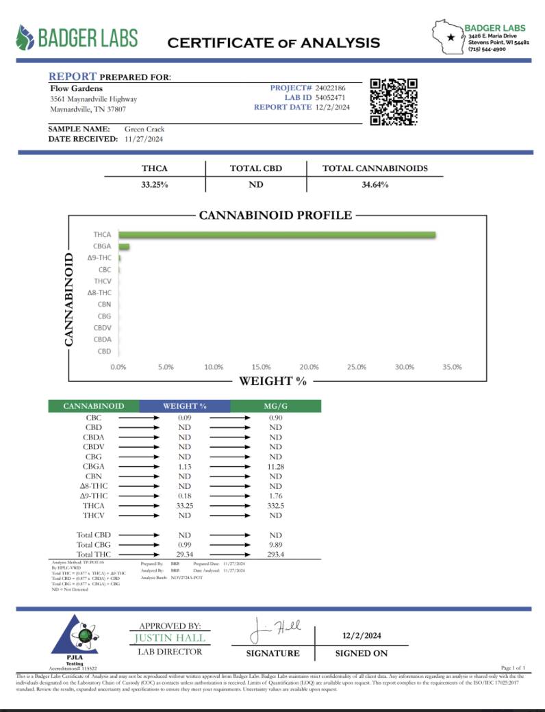 | Total Cannabinoids: 34.64% (346mg/g) | Potency: 33.25% THCa | .18% Δ9THC | 1.13% CBGa | .09% CBC | Total THC: 29.34% (272mg/g) |