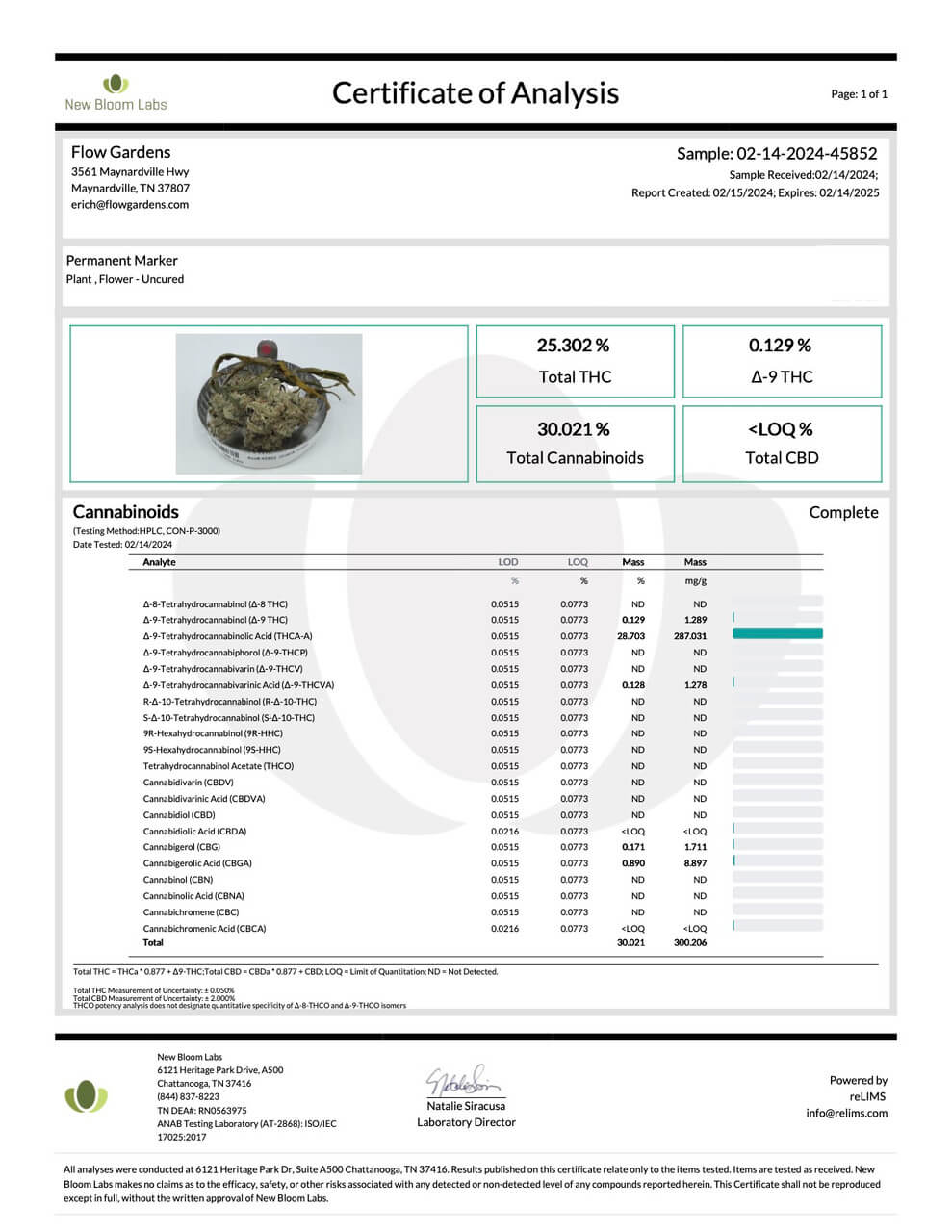 | Total Cannabinoids: 26.43% (264mg/g) | Potency: 29.15% THCa | .29% CBD | .19% CBGa | Total THC: 25.85% (258mg/g) |