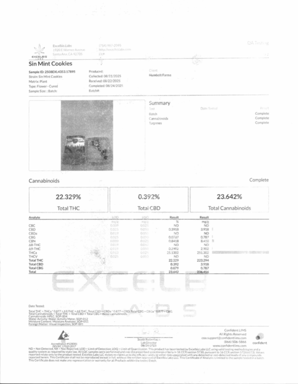 | Total Cannabinoids: 23.64% (236mg/g) | Potency: 22.39% THCa | .29% Δ9THC | .39% CBD | Total THC: 22.3% (223mg/g) |