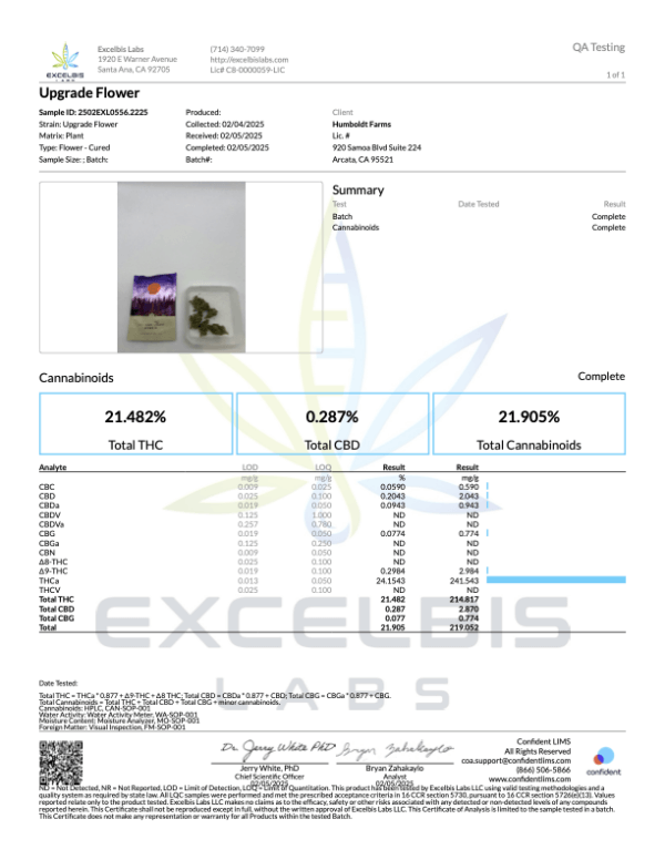 | Top Terpenes: Limonene, Caryophyllene, Linalool | Organically Grown by Humboldt Farms: California Hemp Flower Contains <0.3% Δ9THC | Effects: Uplifted, Relaxed, Creative |