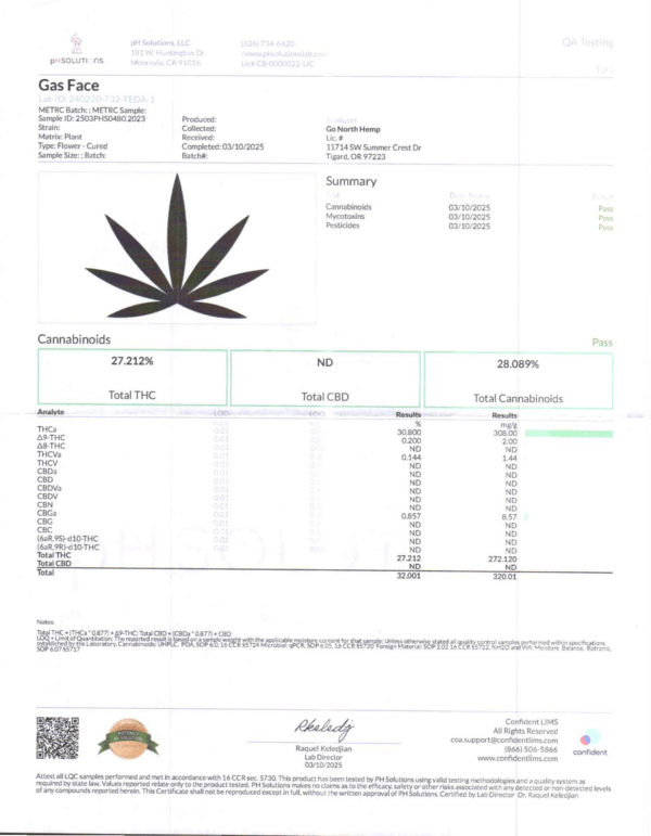 | Total Cannabinoids: 28.08%(280mg/g) | Potency: 30.8% THCa | .2% Δ9THC | .85% CBGa | THCVa .14% | Total THC: 27.21% (272mg/g) |