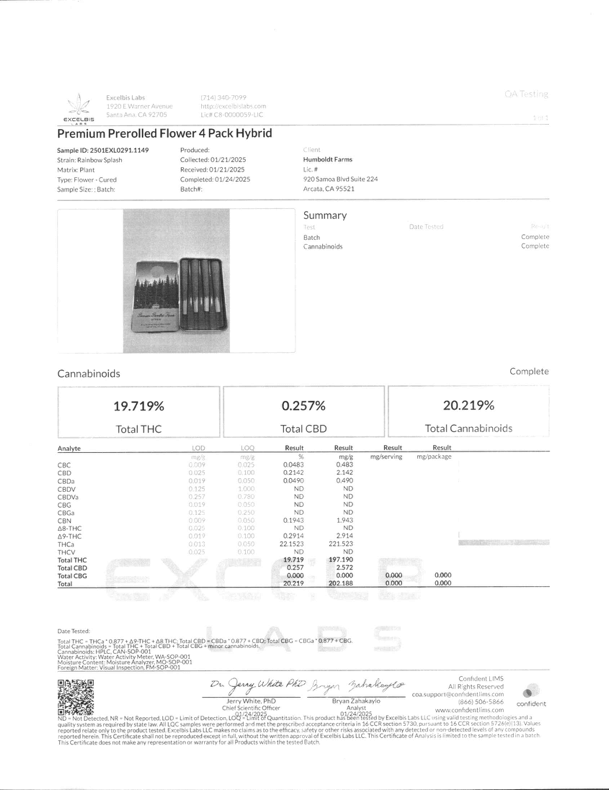 | Total Cannabinoids: 20.22% (202mg/g) | Potency: 22.15% THCa | .29% Δ9THC | .257% CBD | Total THC: 19.71% (197mg/g) |