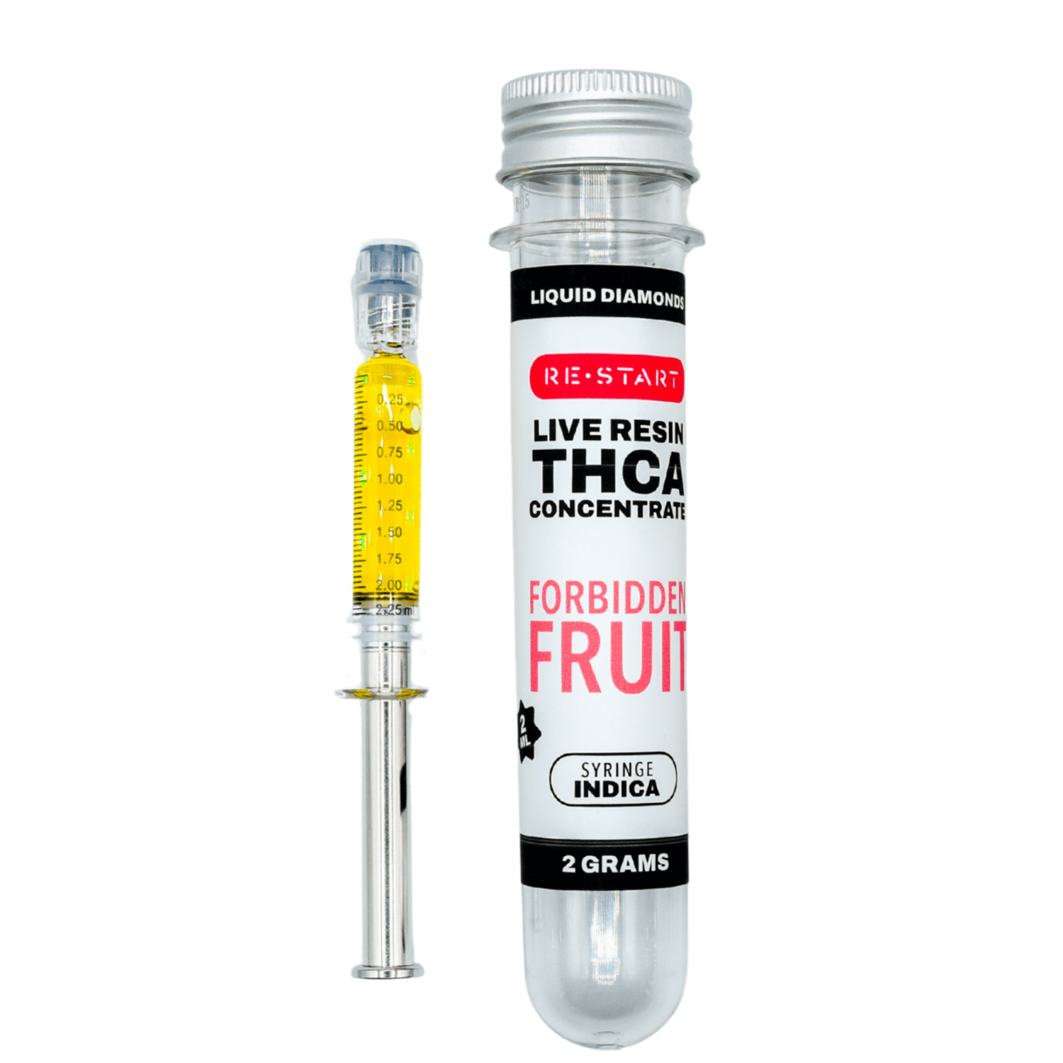 Are you looking for a strong, flavorful, and naturally produced concentrate without all of the unnecessary additives and cutting agents? Look no further! RESTART THCA Forbidden Fruit Syringes are made with THCA liquid diamond live resin and cannabis derived terpenes, making them the cleanest product on the market. No fillers, just cannabis derived components.